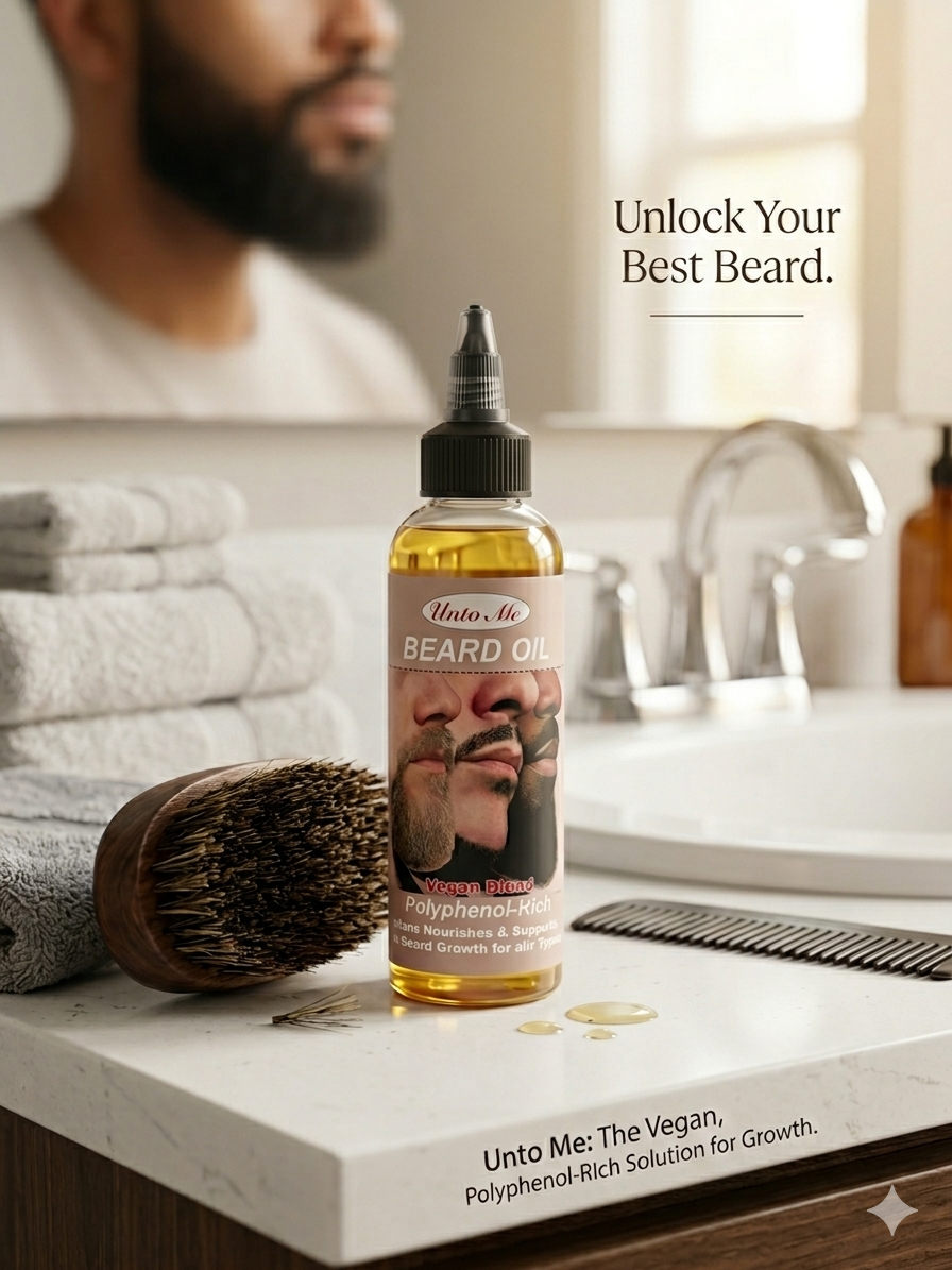 Elevate your beard care with Unto Me Vegan Beard Oil rich in Polyphenols. Designed for softness, strength, and reduce shedding. With a fuller-looking beard, this lightweight oil penetrates deeply without leaving build-up-perfect for daily grooming and long-term beard health. Ingredients include Grapeseed Oil, Jojoba Oil, Argan Oil, Fractionated Coconut Oil, Black Cumin Seed Oil, Rosemary Essential Oil, Bergamot Essential Oil, and Vitamin E Oil.