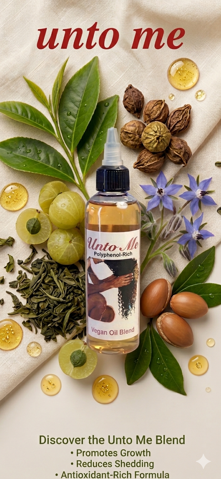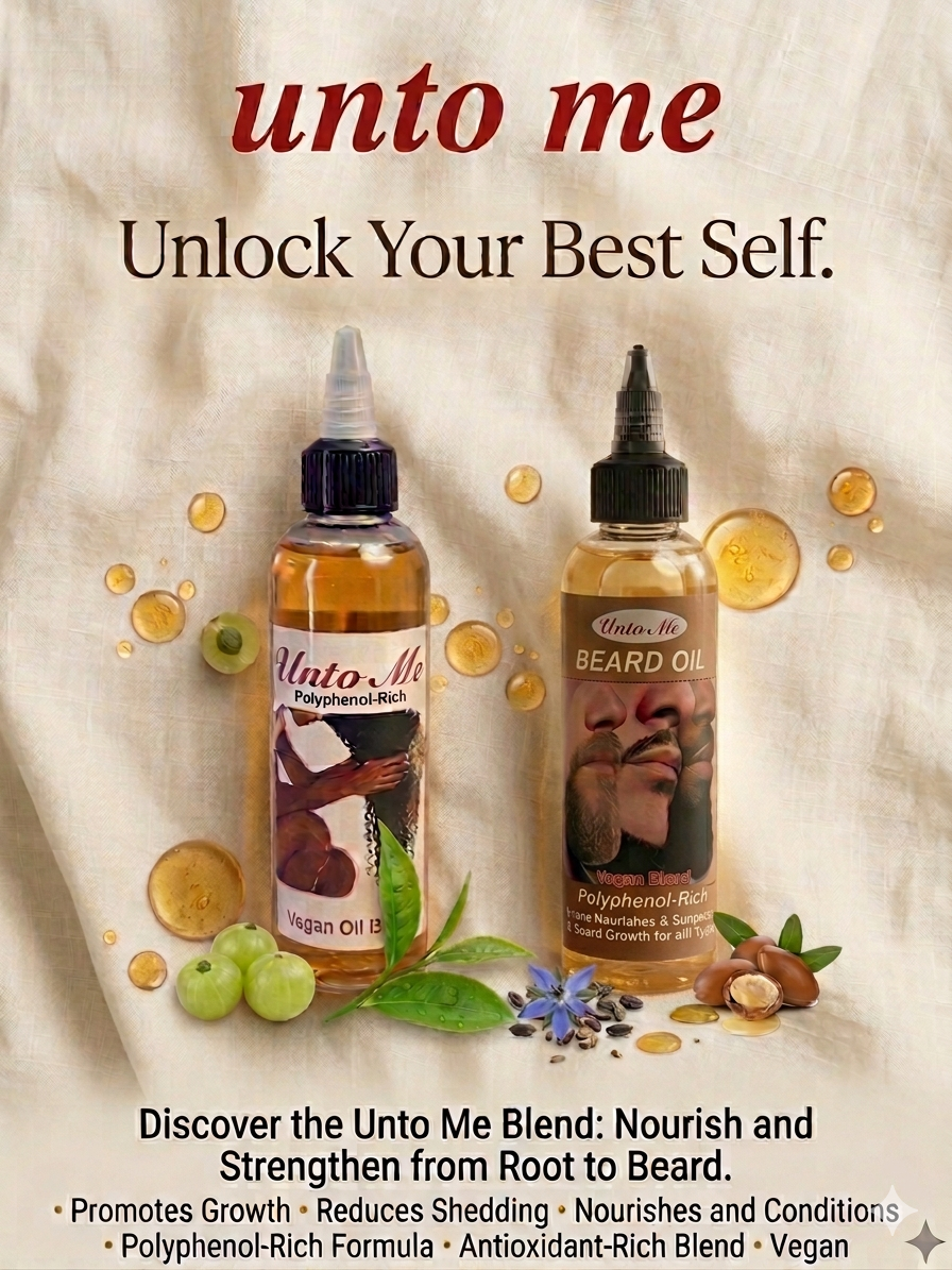 Inspired by prayer and meditation, Unto Me products were created. Our Vegan polyphenol-rich oils nourish, strengthen and protects your hair and beard while promoting growth, and reduces shedding. Crafted with love and intention for a healthy hair and beard experience!